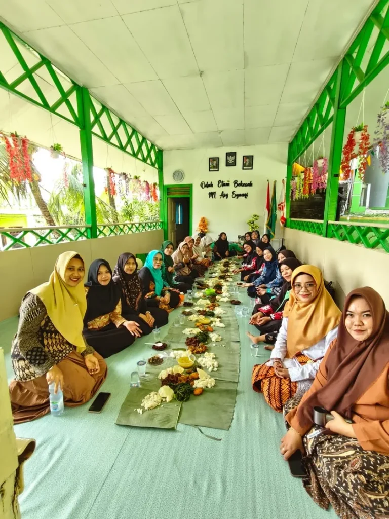 Suasana penuh kehangatan terasa saat seluruh siswa duduk bersama menikmati hidangan yang telah disediakan. Tradisi Beseprah di MI Asy Syauqi bukan hanya menjadi media pelestarian budaya, tetapi juga sarana pendidikan karakter yang mengajarkan nilai persaudaraan, kesederajatan, dan cinta terhadap tradisi lokal.