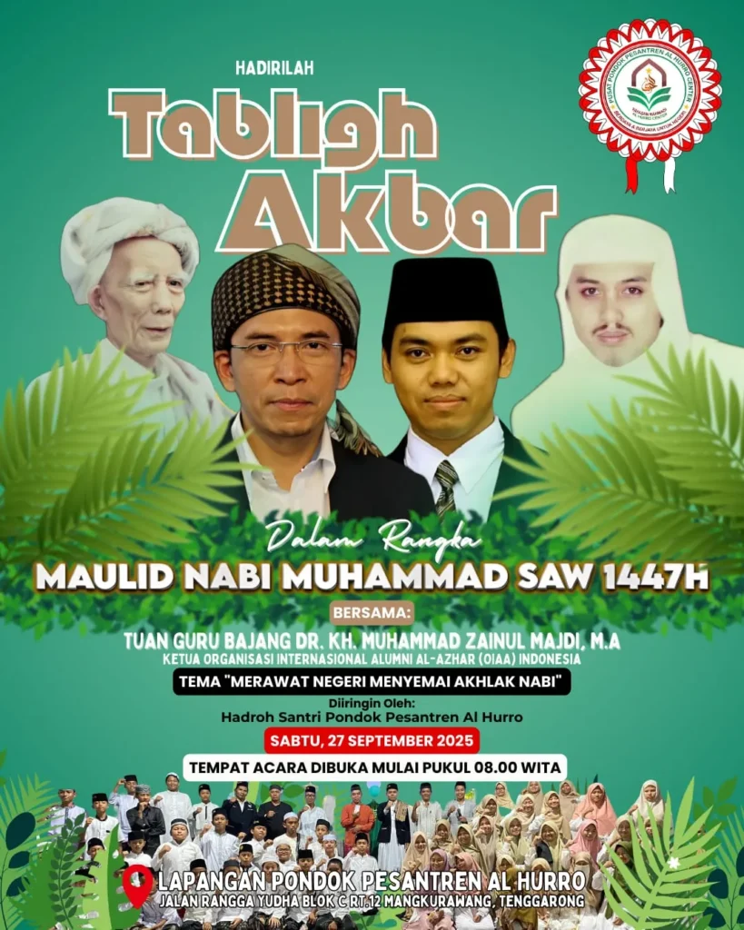 ESENSIAL NEWS – Peringatan Maulid Nabi Muhammad Saw. di Pondok Pesantren Al Hurro Center Kalimantan Timur tahun ini dirangkai dengan kegiatan Tabligh Akbar. Acara ini dijadwalkan berlangsung pada Sabtu, 27 September 2025 bertepatan dengan 14 Rabiul Awal 1446 H, mulai pukul 08.30 WITA di lapangan utama pesantren yang berlokasi di Jalan Rangga Yudha Blok C, Kelurahan Mangkurawang, Kecamatan Tenggarong, Kabupaten Kutai Kartanegara.